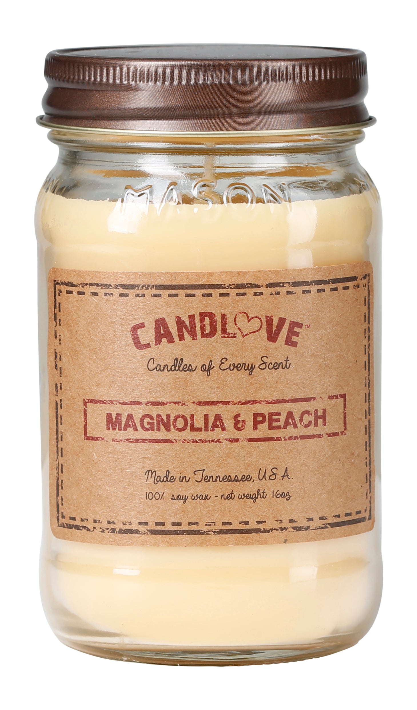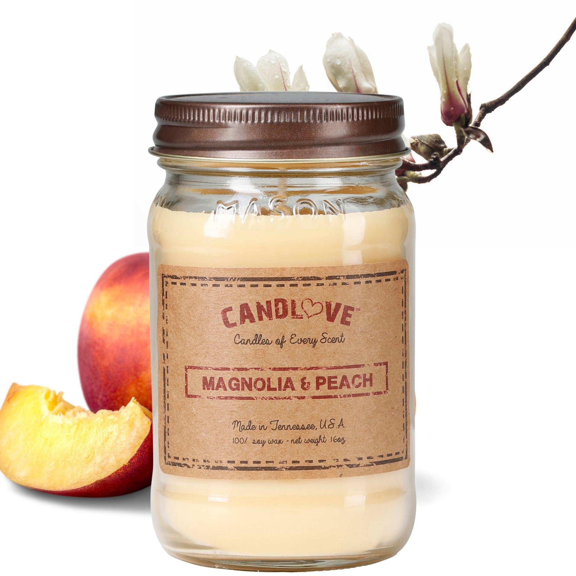 Experience the beauty of nature with our Candlove Magnolia & Peach Scented Candle. Made from 100% soy, this non-toxic candle is hand poured and long burning. Enjoy the highly scented, all natural, clean burning fragrance of magnolia and peach in our 16 oz mason jar. Made in the USA for a truly special experience.