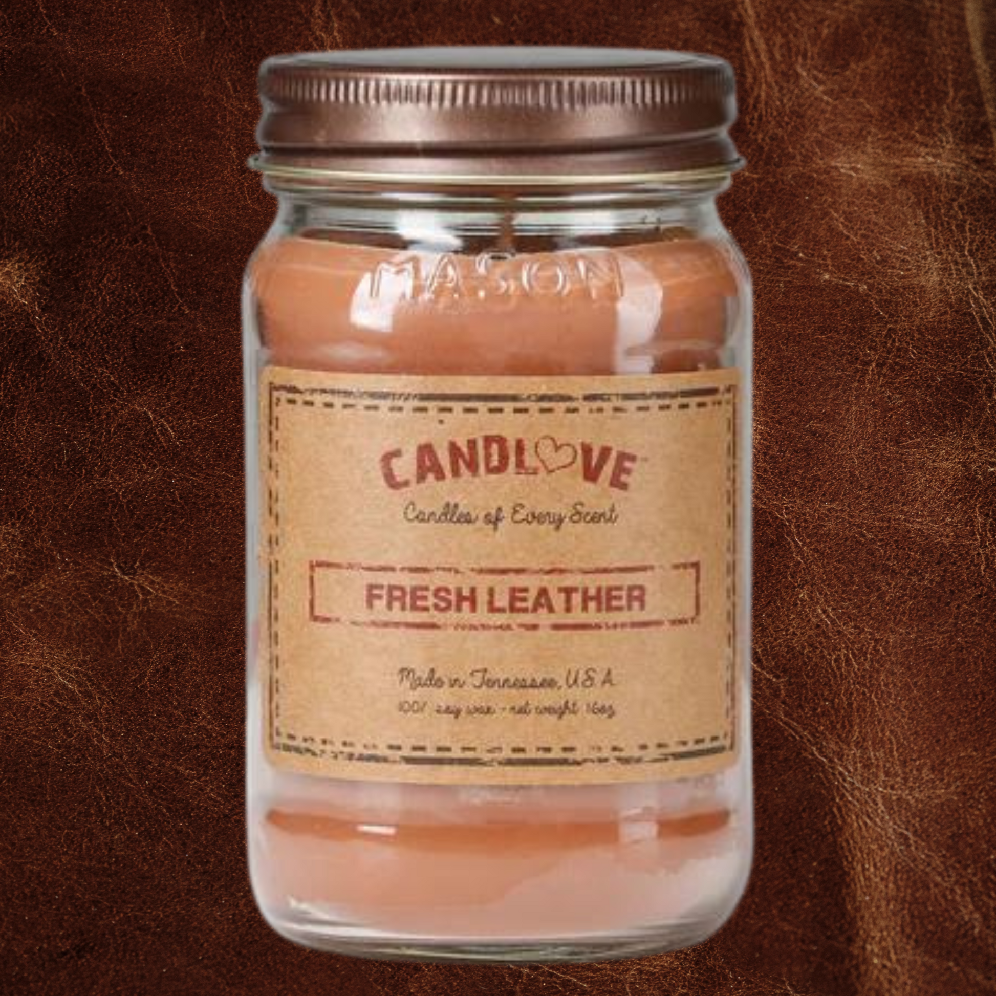 Candlove Fresh Leather Scented Candle - Non-Toxic 100% Soy Candle - Handmade & Hand Poured Long Burning Candle - Highly Scented All Natural Clean Burning Candle (16 OZ Mason Jar) Made in The USA