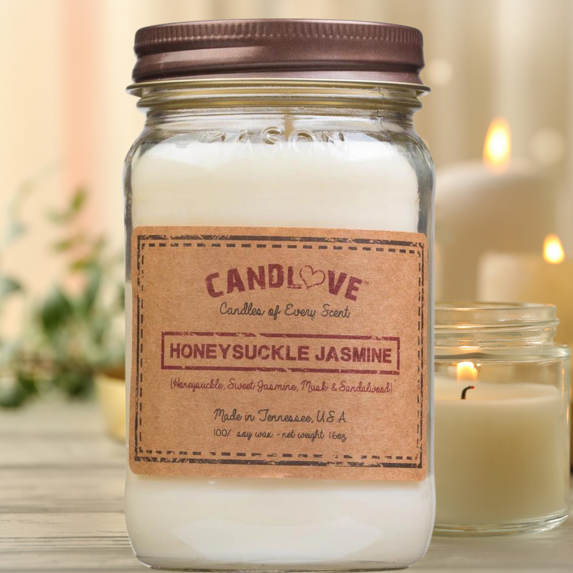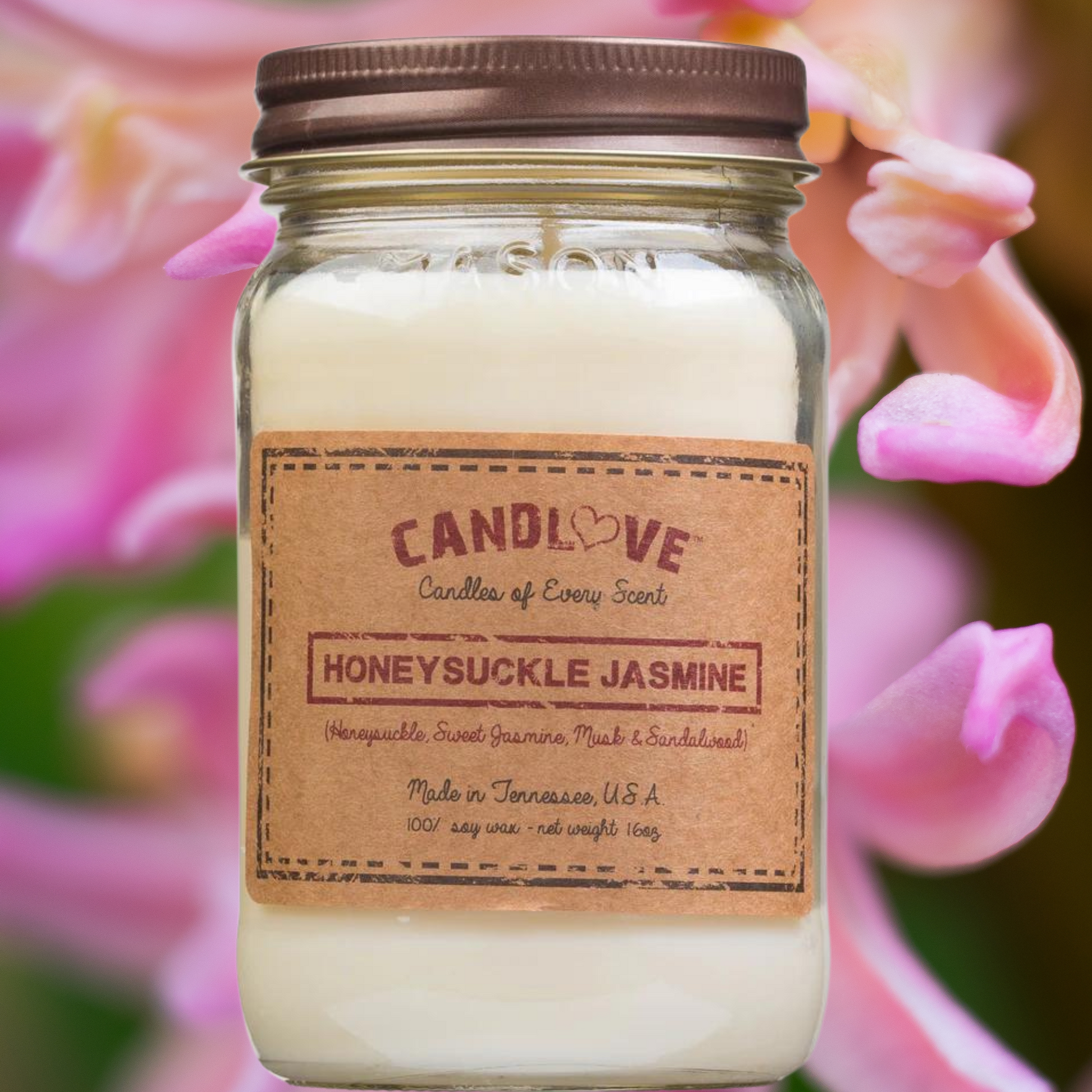 Candlove Honey Suckle Jasmine Scented Candle - Non-Toxic 100% Soy Candle - Handmade & Hand Poured Long Burning Candle - Highly Scented All Natural Clean Burning Candle (16 OZ Mason Jar) Made in The USA