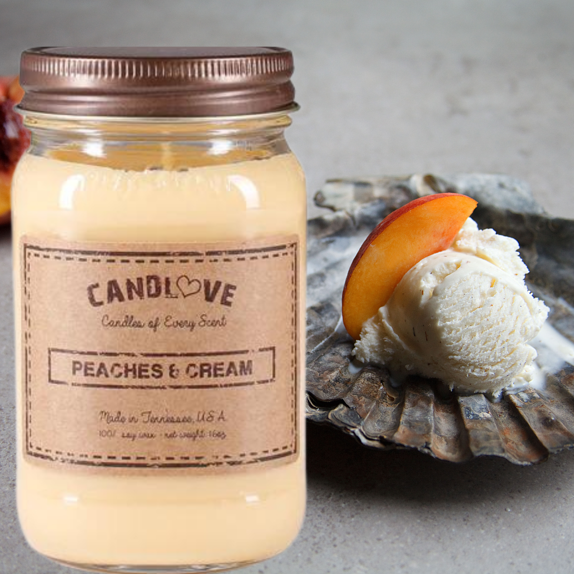 Candlove Peaches Cream Scented Candle - Non-Toxic 100% Soy Candle - Handmade & Hand Poured Long Burning Candle - Highly Scented All Natural Clean Burning Candle (16 OZ Mason Jar) Made in The USA