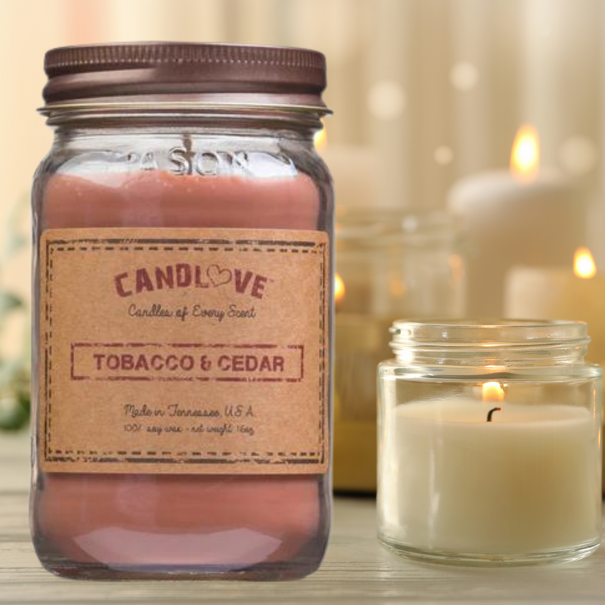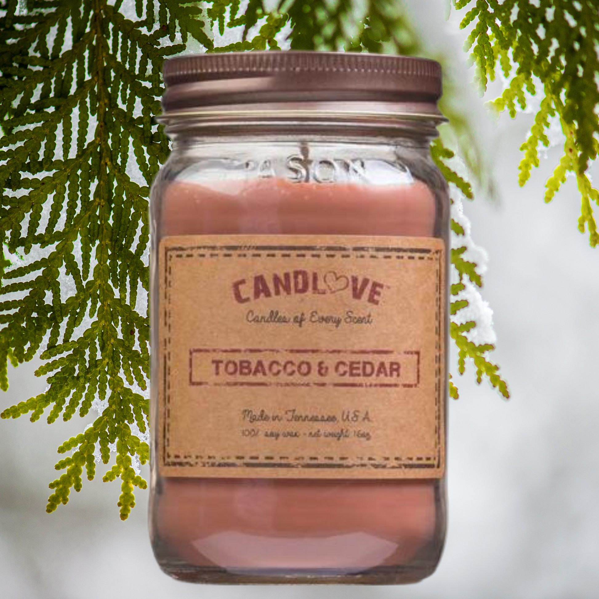 Candlove Tobacco Cedar Scented Candle - Non-Toxic 100% Soy Candle - Handmade & Hand Poured Long Burning Candle - Highly Scented All Natural Clean Burning Candle (16 OZ Mason Jar) Made in The USA